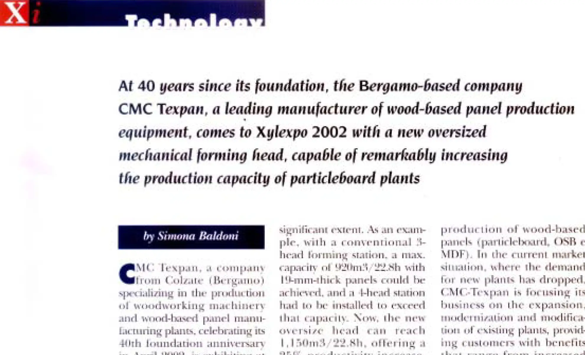 At 40 years since its foundation, the Bergamo-based company CMC Texpan, a leading manufacturer of wood-based panel production equipment, comes to Xylexpo 2002 with a new oversized mechanical forming head, capable of remarkably increasing the production capacity of particleboard plants.