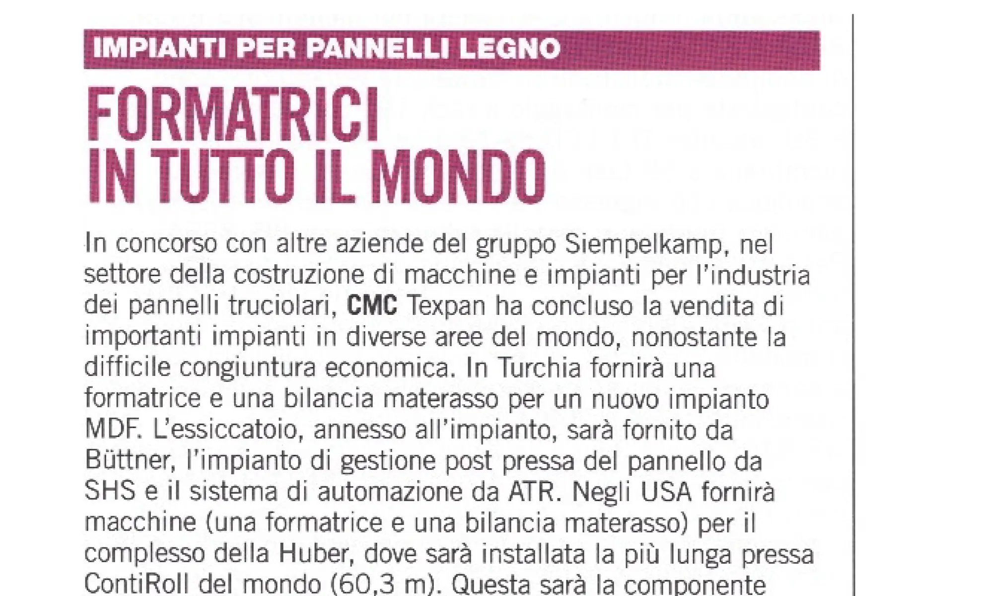 In concorso con altre aziende del gruppo Siempelkamp, nel settore della costruzione di macchine e impianti per l’industria dei pannelli truciolari, CMC Texpan ha concluso la vendita di importanti impianti in diverse aree del mondo, nonostante la difficile congiuntura economica.