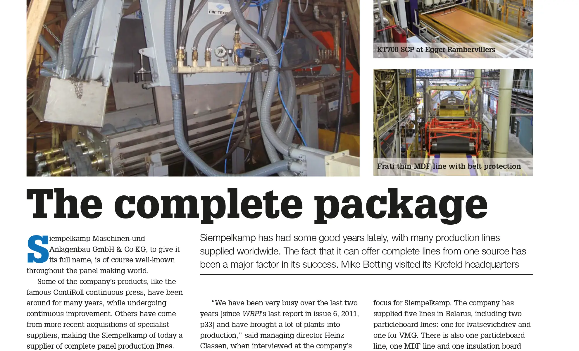 Siempelkamp Maschinen-und Anlagenbau GmbH & Co KG, to give it its full name, is of course well-known throughout the panel making world. Some of the company’s products, like the famous ContiRoII continuous press, have been around for many years, while undergoing continuous improvement. Others have come from more recent acquisitions of specialist suppliers, making the Siempelkamp of today a supplier of complete panel roduction lines.