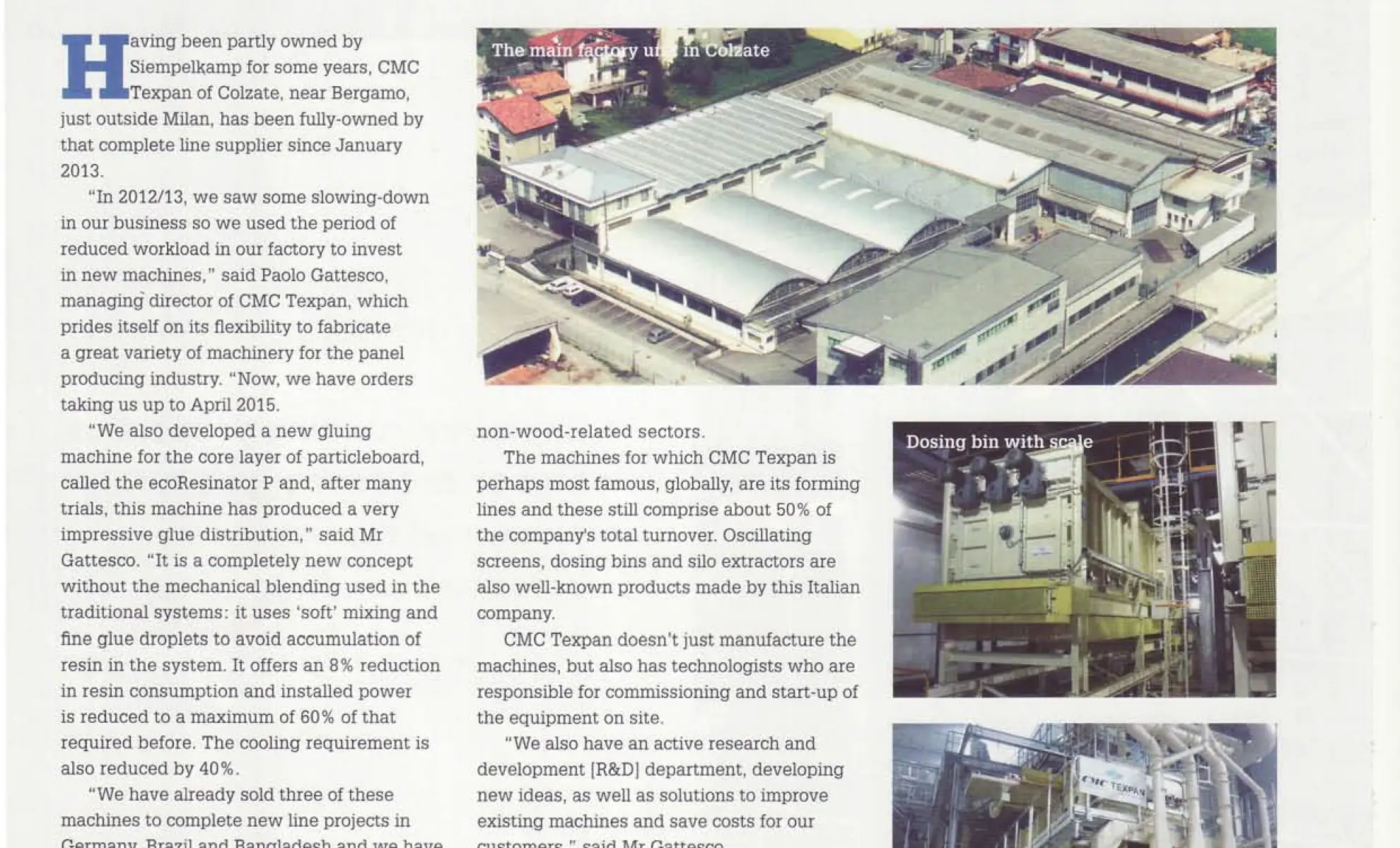 Having been partly owned by Siempelkamp for some years, CMC Texpan of Colzate, near Bergamo, just outside Milan, has been fully-owned by that complete line supplier since January 2013.