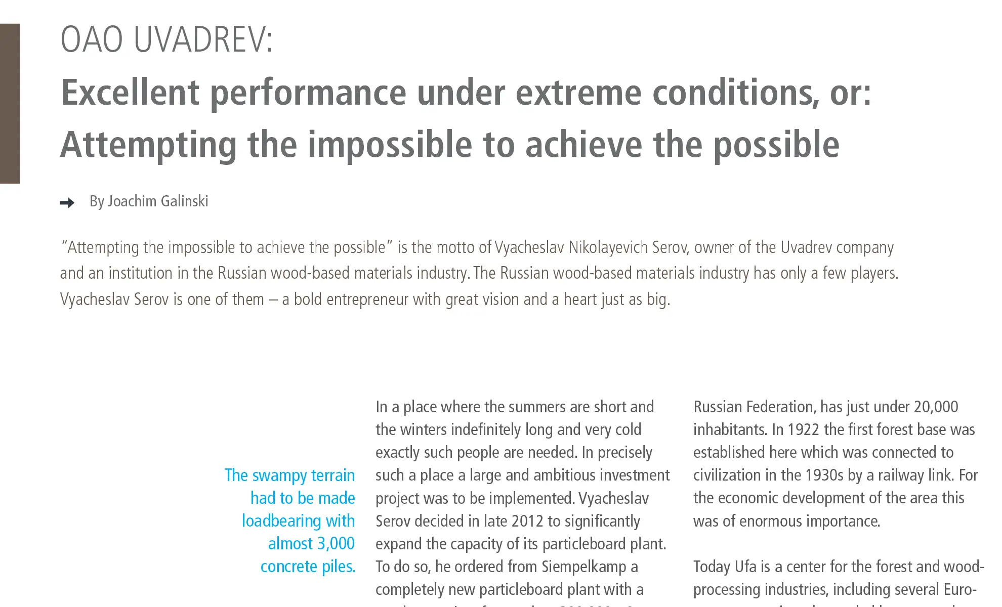 “Attempting the impossible to achieve the possible” is the motto of Vyacheslav Nikolayevich Serov, owner of the Uvadrev company and an institution in the Russian wood-based materials industry. The Russian wood-based materials industry has only a few players Vyacheslav Serov is one of them a bold entrepreneur with great vision and a heart just as big.