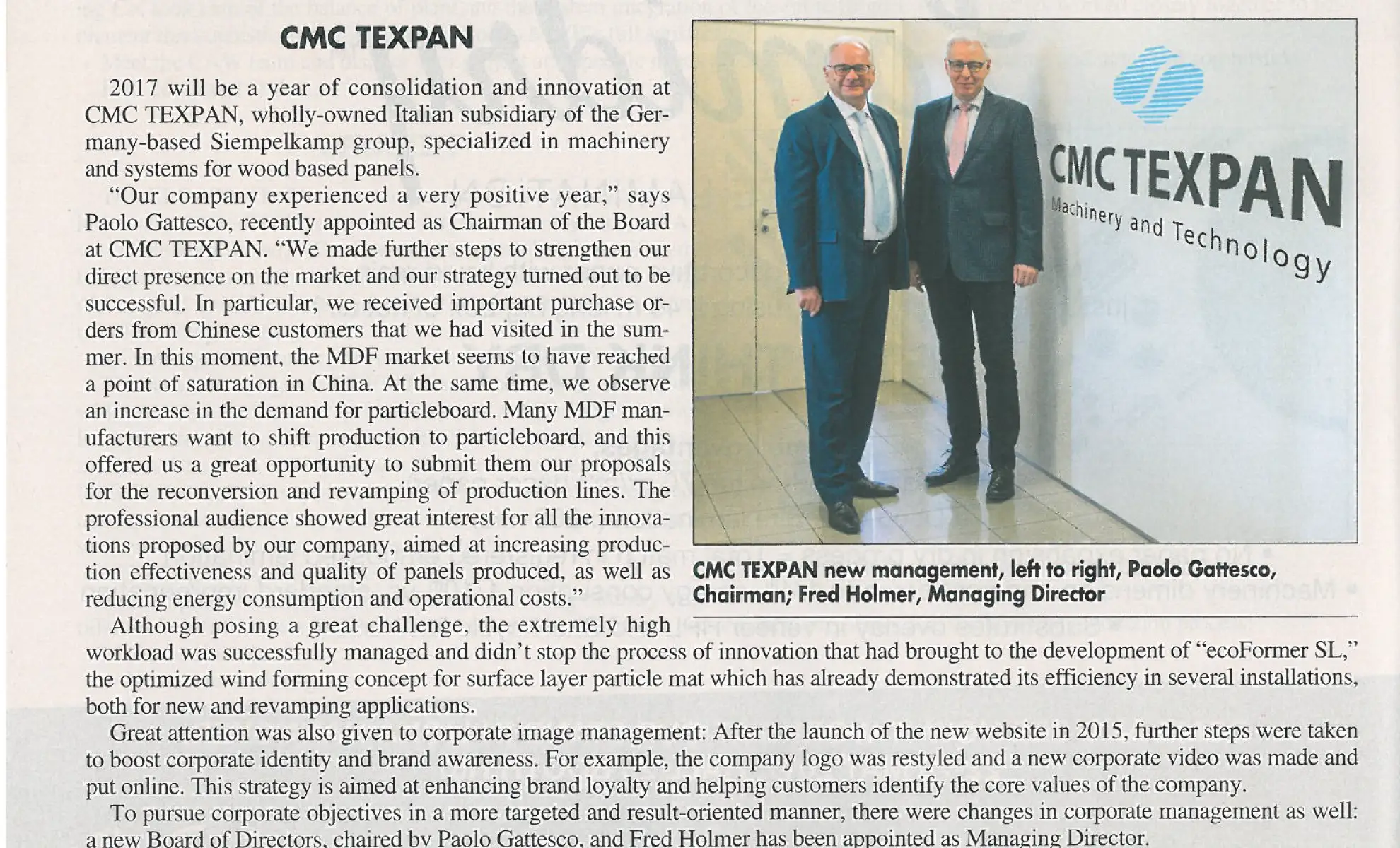 2017 will be a year of consolidation and innovation at CMC TEXPAN, whoily-owned Italian subsidiary of the Germany-based Siempelkamp group, specialized in machinery and systems for wood based panels.