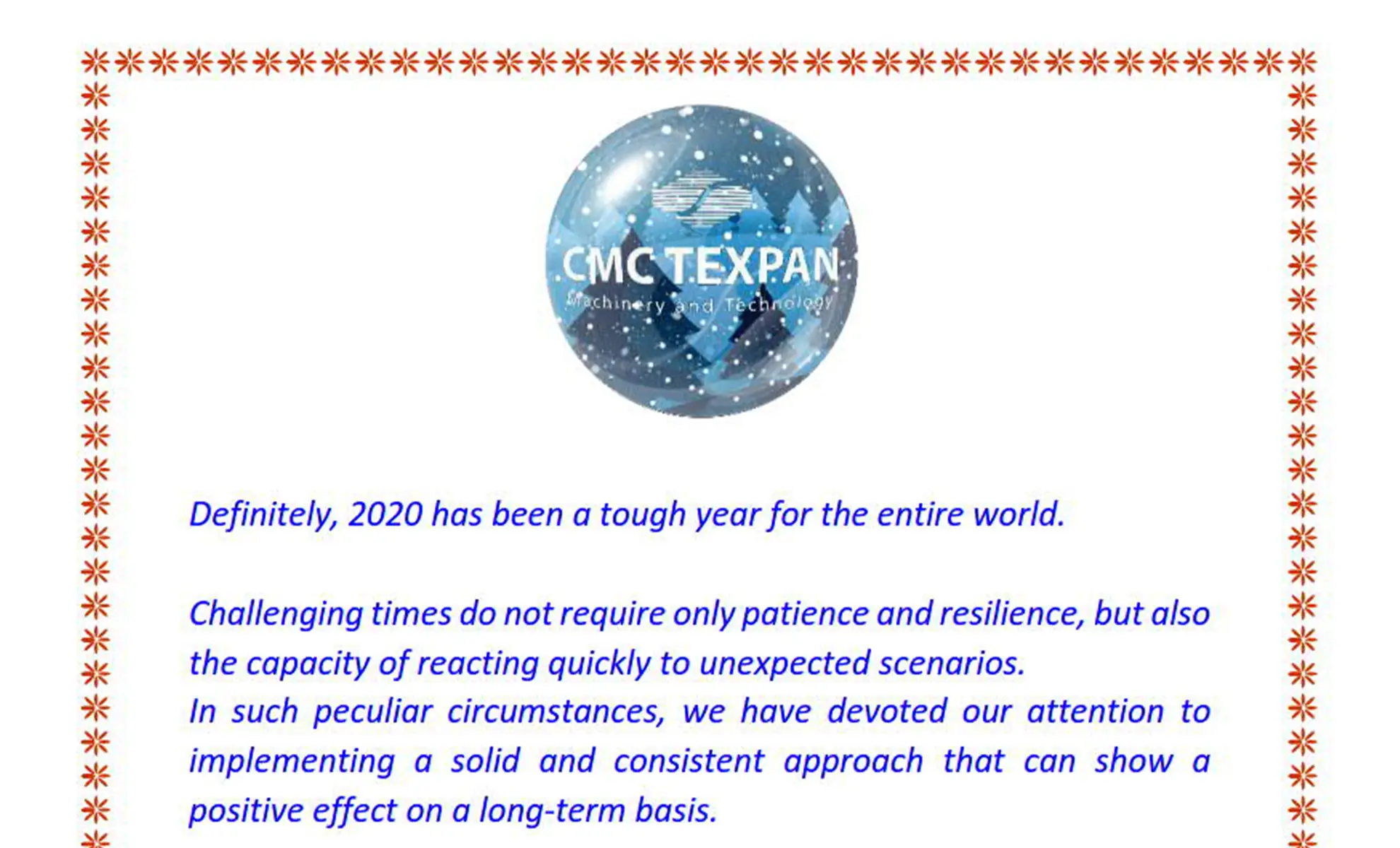 Definitely, 2020 has been a tough yearfor the entire world. Challenging times do not require only patience and resilience, but also the capacity of reacting quickly to unexpected scenarios. In such peculiar circumstances, we have devoted our attention to implementing a solid and consistent approach that can show a positive effect on a long-term basis. We have taken this situation as an opportunity to “think outside the box”: we have focused on new fields ofactivity and we have explored more in detail those “alternative” sectors in which we already developed significant experience, of course without forgetting our basic commitment to our core business, the wood-based panel industry. On this occasion, we would like to express our sincere appreciation for the trust you have placed in us and assure you of our best efforts to provide customer-oriented, reliable, sustainable, environmentally conscious, and cost-effective solutions. May you and all your loved ones a wonderful Christmas time and a happy, healthy and successful New Year!