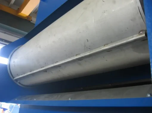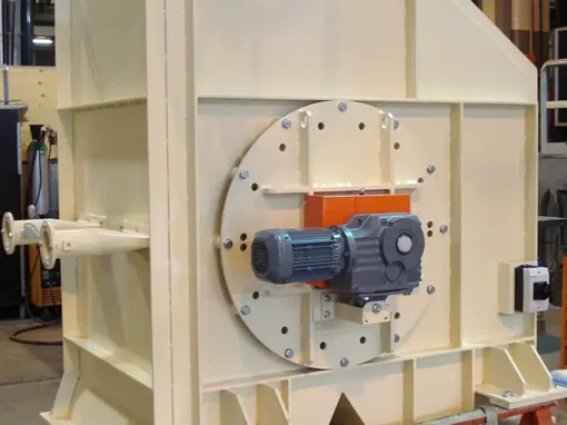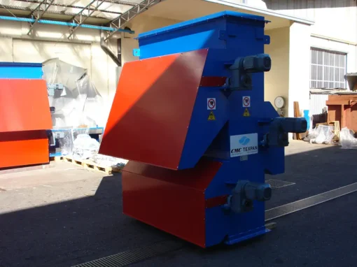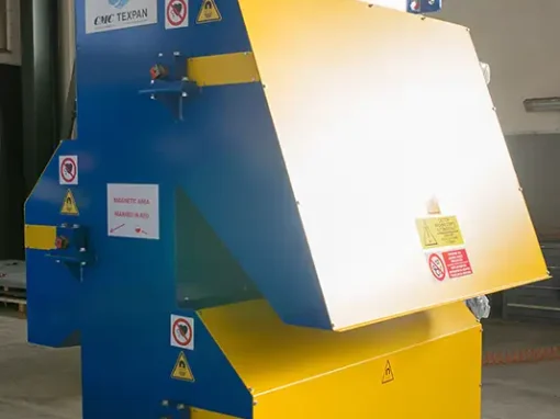 The magnetic drum consists of a rotating drum out of stainless steel. The drum includes a fixed shaft holding a half moon magnet element made of a soft iron support, onto which neodymium permanent magnets are fitted. As the drum rotates, wooden material will be conveyed towards a discharge hopper, while ferrous components will be retained on the drum surface until they are in the area equipped with the magnet element located inside, then they are released when they reach the non-magnetized area.